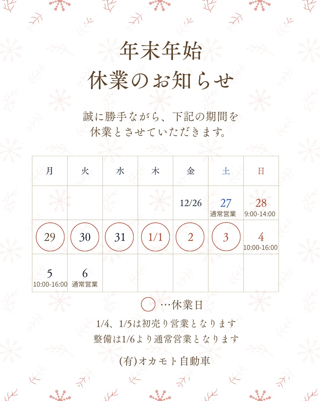 年始の営業は4日から、※整備は6日からのご入庫となります。